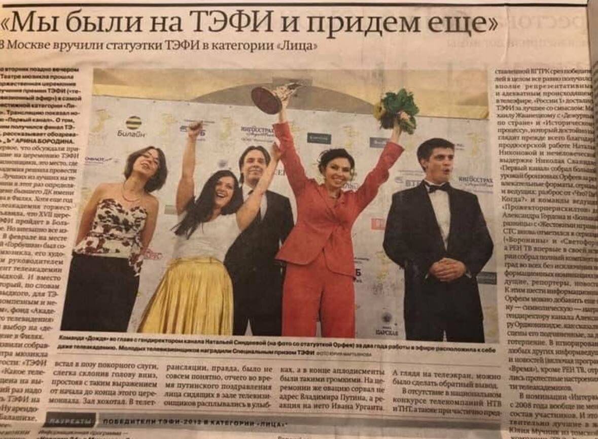 Сегодня главную телевизионную премию России получил ведущий Дмитрий Киселев и телепрограмма «60 минут» со Скабеевой. И это примерно всё говорит и об этом телевидении, и об этом времени . Но когда-то было так. И мы придём ещё. В 2011 году телеканал «Дождь»** получил специальный приз национального телевизионного конкурса «ТЭФИ—2011», учреждённого «Академией российского телевидения». Это было торжество медведизма © и «Дождя»**, креативный продюсер коего по сию пору числится одесситка Анна Викторовна*, креатура Леонида Парфёнова, коего Борис Березовский видел в перспективе президентом РФ. К слову, её отец Виктор Лошак должен был получить в этот день своё ТЭФИ (он ведёт программу «Очень личное» на государственном ОТР, созданным с подачи того же Медведева, покровителя т/к «Дождь»**), но что-то не срослось, финалист сошёл с дистанции: Павел Зарубин обошёл и Кирилла Позднякова, и отца иноагента Монгайт. Ты должен продолжать своё дело, у него очень внятная миссия, она очерчивается буквально нес