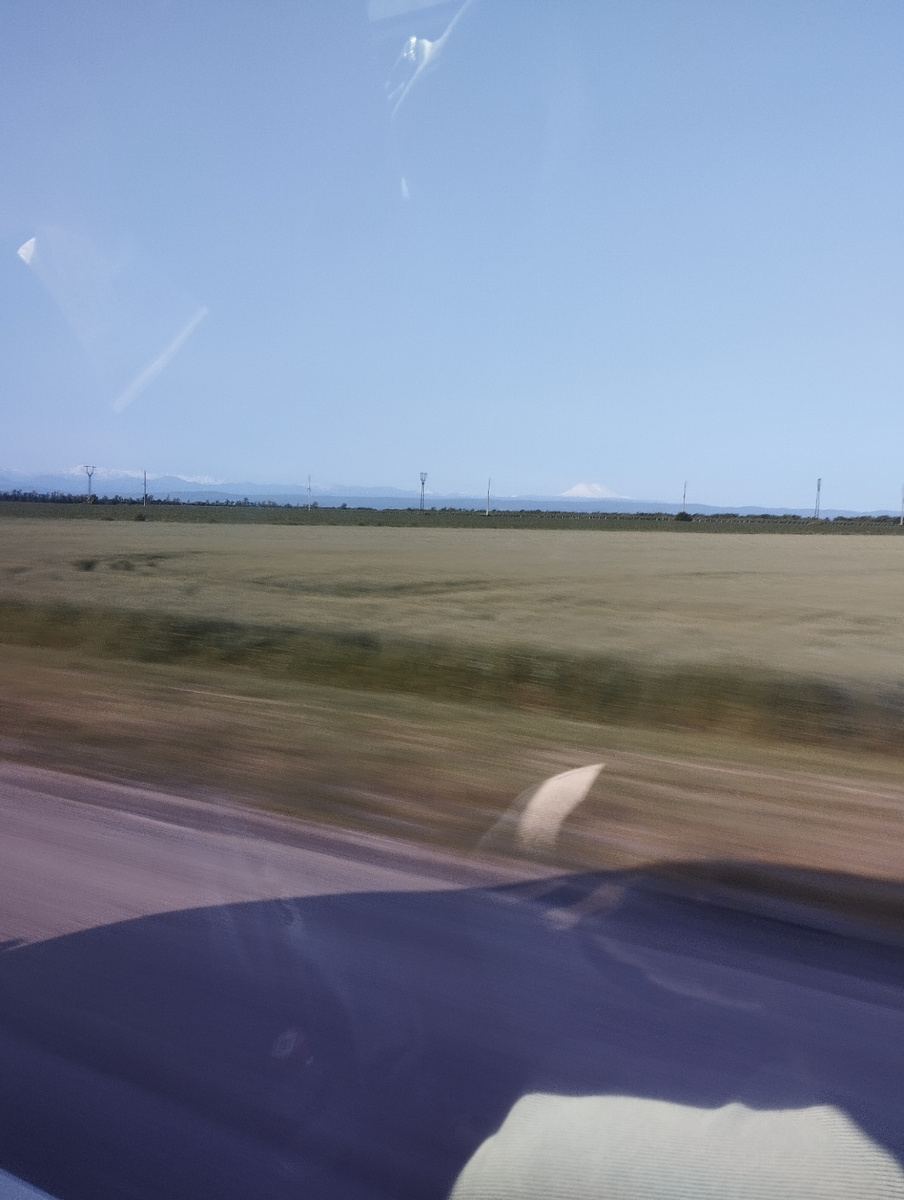 Как вы думаете, что далеко впереди на этом фото, которое удалось мне сделать через стекло мчащегося по трассе микроавтобуса? Обратите внимание на нечто двугорбое белоснежное на горизонте справа.