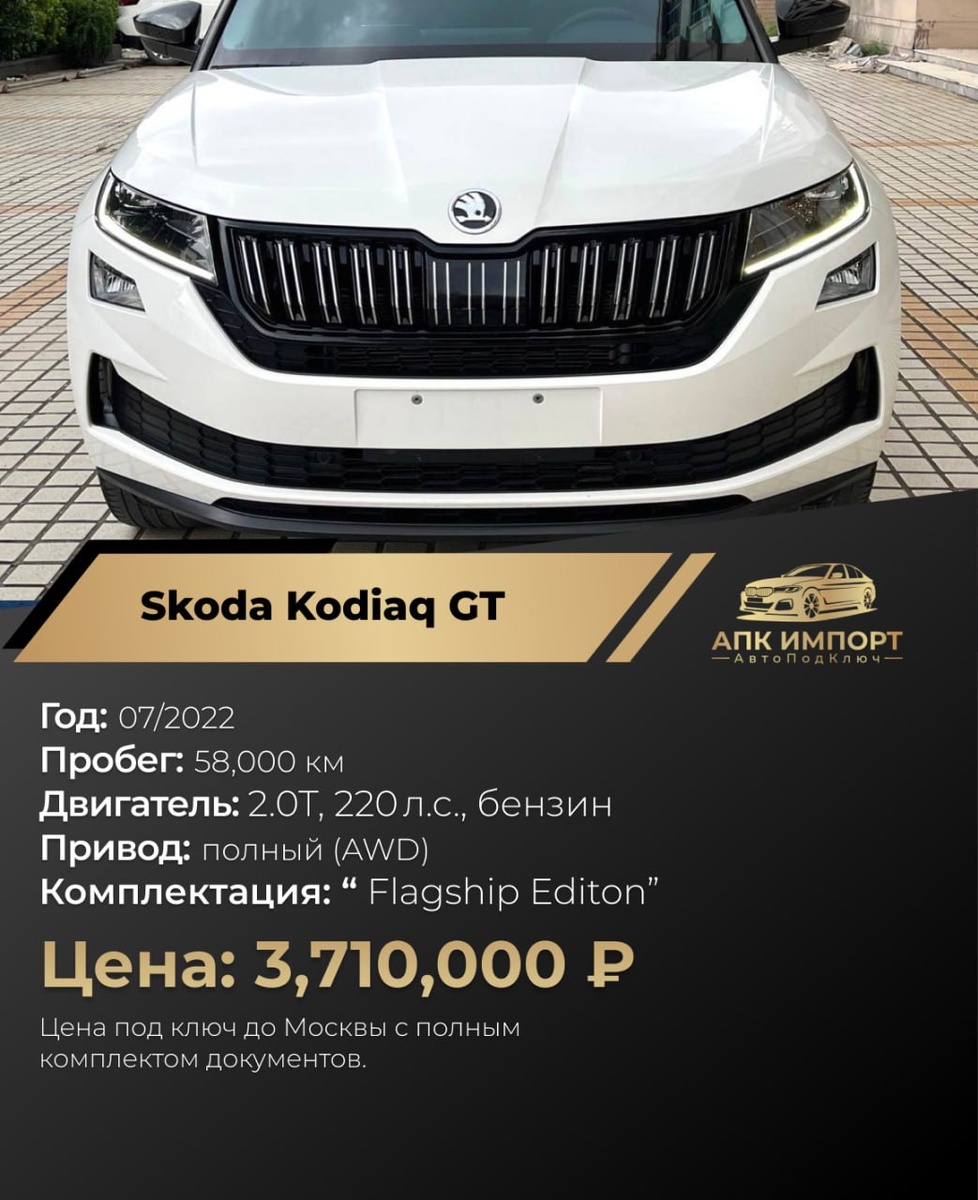 🚘 Skoda Kodiaq GT (Flagship Edition, 4WD) 📍 Основные характеристики: 🔹 Год выпуска: 07/2022 🔹 Пробег: 58 000 км 🔹 Двигатель: 2.0T, 220 л.с. 🔹 Привод: полный 🔥 Спортивный премиум-кроссовер в максимальной комплектации. Версия GT с более динамичным дизайном задней части кузова, заниженной крышей и спортивными акцентами. Из Китая. ➡️ Комплектация Flagship Edition включает: панорамную крышу, цифровую приборную панель, мультимедиа с Apple CarPlay и Android Auto, камеры кругового обзора, адаптивный круиз-контроль, систему удержания в полосе, вентиляцию и подогрев сидений, электропривод с памятью положения, атмосферную подсветку салона. 💰 Цена: 3,710,000 рублей под ключ с доставкой до Москвы и полным комплектом документов! ⬇️ Больше фотографий в комментариях 🚗 Пишите в личные сообщения для консультации и заказа! #апкимпорт #Skoda