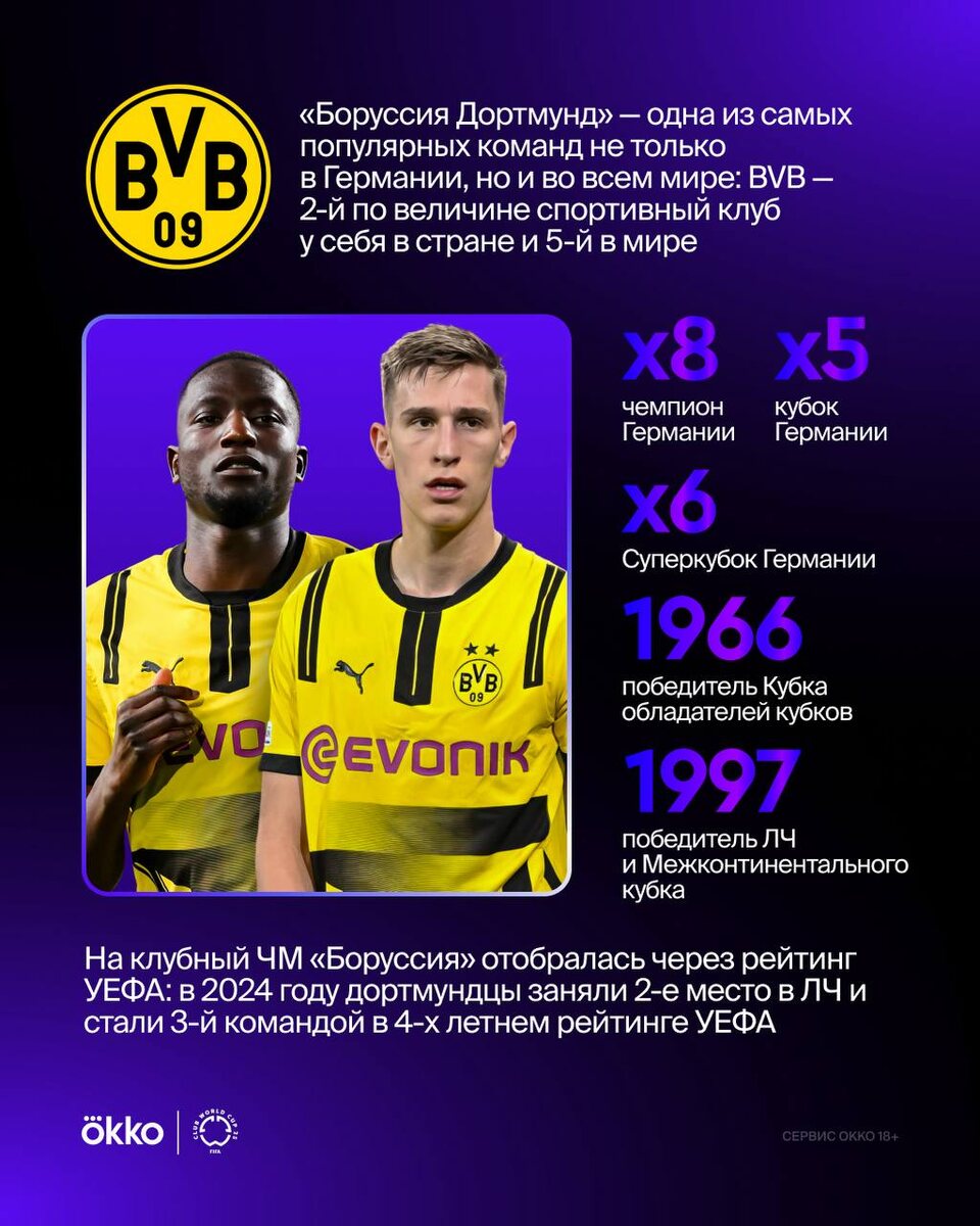 Направляемся в группу F и сразу же встречаем топ-клуб Бундеслиги. Это «Боруссия Дортмунд»! ⚽️ Легендарная «желтая стена», Юрген Клопп, Левандовски и Ройс, ЛЧ 1997 года и трофеи в Германии. Эта команда не нуждается в представлении 🏆