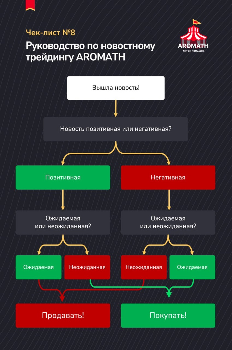 📌 Как читать новости и зарабатывать на реакции рынка? Новостной трейдинг или трейдинг по новостям - полный алгоритм от Aromath. Если Вы просто читаете заголовки - вы всегда будете максимум вторым. Рынок не реагирует на новости. Он реагирует на неожиданности. 💡Вот базовая схема, по которой я торгую новости последние 15 лет. 1. Вышла новость. Сначала не думайте, хорошо это или плохо. Сначала - это было ожидаемо? 2. Если новость плохая, но её ждали - продавать уже некуда. Всё в цене. Рынок отыграл это ещё до релиза. Тут обычно покупают. 3. Если новость хорошая, но её ждали - то же самое. Покупали заранее, теперь продают. Здесь нет будущего роста - только фиксация. 4. Но если что-то произошло неожиданно - начинается движение. Вышла неожиданно плохая новость → страх → паника → рынок падает резко → вход на откате. Вышла неожиданно хорошая новость → эйфория → резкий рост → выход на импульсе. Вот и всё. ❗️Не новости двигают цену, а разрыв между ожиданиями и реальностью. Учитесь вид