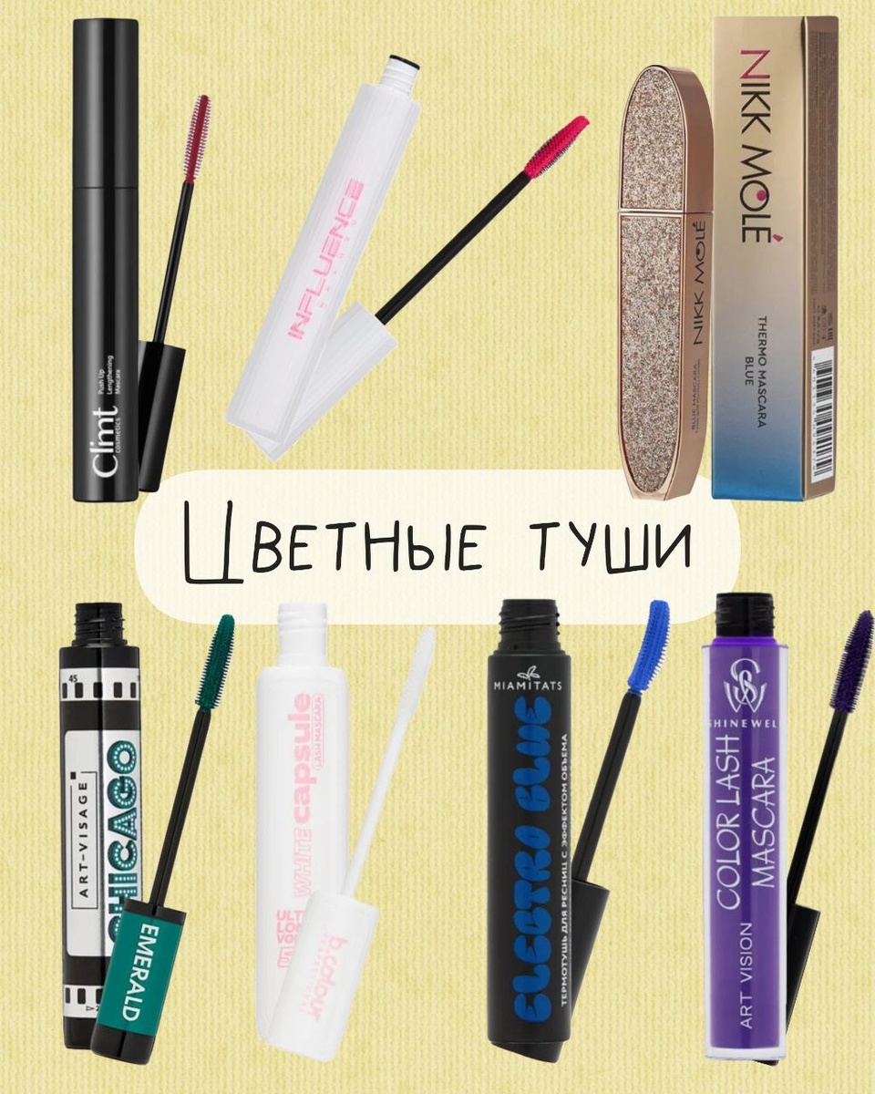 Когда-то за цветной тушью приходилось охотиться, теперь — только успевай тестировать Помню, как в прошлом году с боем нашла зелёную тушь не российского бренда. Намазюкаласт и получила эффект «плесени» на глазах. С тех пор вывела правило: если тушь цветная, то только проверенная и, желательно, от наших И вот радость для глаз (в прямом смысле): • Climt Thermo Cocoon — благородный бордо • Influence Chromophora — жизнерадостная розовая • Nikk Mole Thermo — насыщенный синий • Art Visage Chicago — темно зелёная • B.Colour — белоснежная, для тех, кто не боится • Miamitats Volume-Effect Thermo — небесно-голубая • Shinewell Color Lash — фиолетовая сказка Пробовали цветные? Или по классике пользуетесь чёрными?