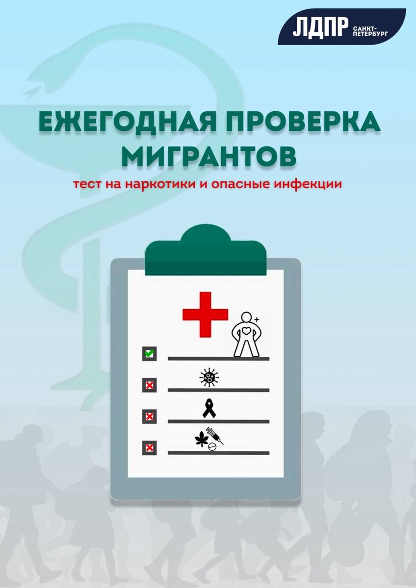 Ежегодные проверки мигрантов на наркотики и опасные болезни ЛДПР внесла в Госдуму законопроект, обязывающий мигрантов с РВП или ВНЖ ежегодно проходить медицинское освидетельствование на наркотики и опасные инфекции. Положительный результат анализа или отказ от проверки повлекут за собой аннулирование разрешительных документов и депортацию. Инициатива, внесенная 11 июня 2025 года, объясняется обеспокоенностью по поводу угрозы здоровью россиян и распространения наркомании. Председатель партии Леонид Слуцкий заявил, что однократное освидетельствование при получении РВП или ВНЖ недостаточно. Мигранты представляют группу риска по ряду заболеваний и наркозависимости, ссылаясь на статистику тяжких преступлений, связанных с наркотиками, и данные о высоком уровне инфекционных заболеваний среди мигрантов в отдельных регионах (например, 179 случаев в Тульской области в 2024 году, включая 141 случай сифилиса). ЛДПР считает, что предложенные меры необходимы для защиты населения и поддержания о