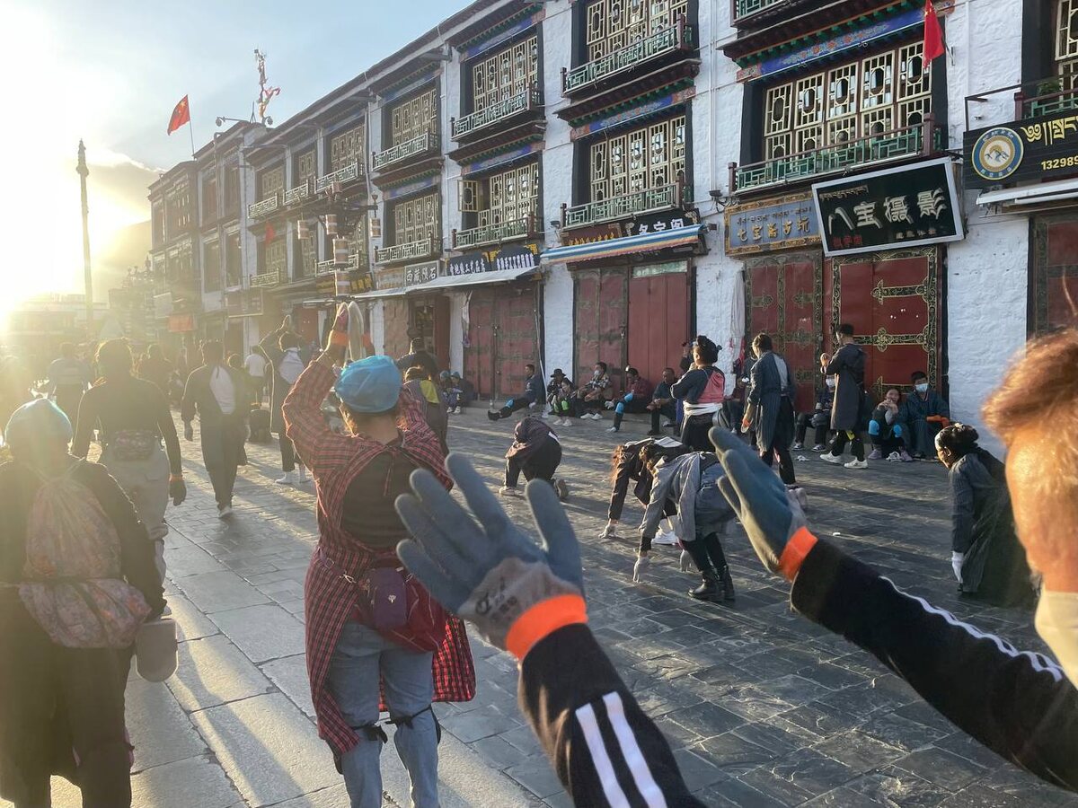 Сегодня очень важный день для тибетских буддистов – пятнадцатый лунный день месяца Саган Дава. День, когда Будда обрёл просветление. По этому поводу вокруг храма Джоканг не протолкнуться. Люди идут сплошным потоком, совершая кору вокруг храма. Для тех, кто делает простирания, выделена отдельная полоса. Чем-то мне это напомнило наши марафоны. Наверное тем, что для многих молодых людей, судя по всему, прохождение этой коры с простираниями – мероприятие больше похоже на спортивное, чем на духовную практику. Картину, приближающую сиё действо к марафону, дополняли монахи, раздающие воду, и зрители, сидящие на крылечках окрестных кафешек и многочисленные китайские блогеры, ведущие прямые репортажи с места событий.