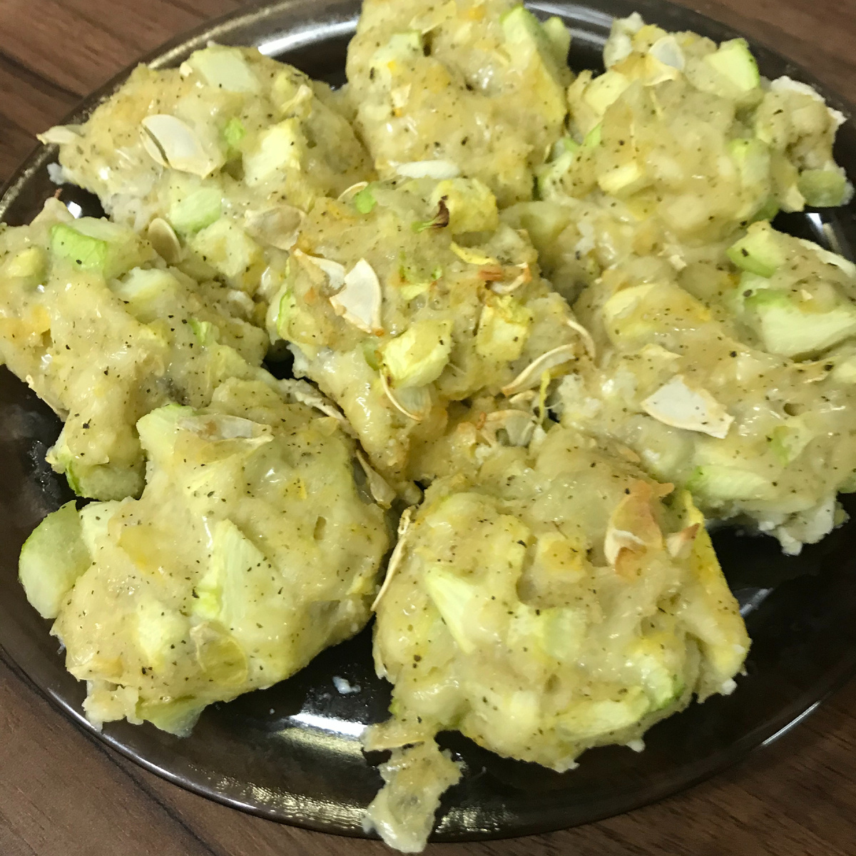 🔹1–2 столовые ложки растительного масла. 1️. Сыр натрите на средней тёрке. 2️. Кабачки нарежьте мелкими кубиками. 3️. Смешайте с панировочными сухарями, сыром, яйцами, чесноком, базиликом и солью.