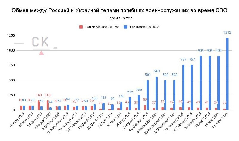 Теперь о конкретных проблемах и почему в Киеве хотели затянуть этот вопрос, сославшись на идентификацию. Разовая партия трупов сама по себе не несёт рисков для Украины, однако похоже в Киеве понимают, что это не последняя учитывая тенденцию. На картинке график обмена телами и мы видим, что на самом деле они идут почти всё время, а крупные партии по 500-1000 челочек Киев получает каждый месяц с прошлой осени. По ним, кстати, вопросов с идентификацией не было, забирали и не жужжали. Заодно график нам показывает, что количество тел никак не связано с потерями сторон и их соотношением, он отражает лишь характер войны (невозможность вытаскивать тела с передовых позиций и серой зоны) и то, что тела, как всегда было в мировой истории, собирает тот, за кем остаётся поле боя. А что Россия наступает — сомнений не вызывает. Когда летом 2023 года наступала Украина, то уже у Киева было больше российских тел. Однако увеличилось не просто количество тел, кардинально поменялась структура потерь ВС