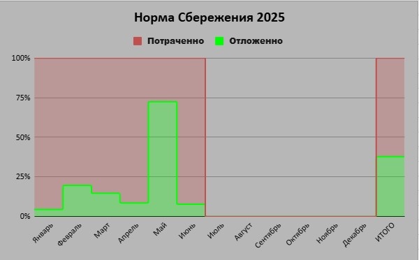 Всех приветствую, Прошёл очередной месяц, пора подводить итоги. За июнь норма сбережения вышла - 7,8% После ударного мая с нормой сбережения в 72% Как-то грустновато, но это особенность текущей мотивации, что оклада хватает в основном на текущие расходы и ипотеку. Ну а теперь к расходам. Тут все как всегда ежемесячный платеж и досрочка до ровной цифры в 30. И в июне ровно год как я взял ипотеку. Дом пока не достроен, но финиш виден. После нескольких пересчетов решил что все таки выгоднее продлить полис чем получить повышение ставки. Плюсом получил 2000 кешбэка за полюс. Ну поесть мы любим, так что это основная статья ежемесячных расходов, превышая даже ипотеку. В этот раз ничего особенного не было, воскресные завтраки пару раз на вынос по пятницам и продукты домой. Тут некстати была акция в самокате что вылилось во внеплановые покупки После первой дальней поездки в этом году выяснилось что переднее колесо надо менять. Тут всего по немного и рабочие расходы Приглашаю всех в мой ТГ кан