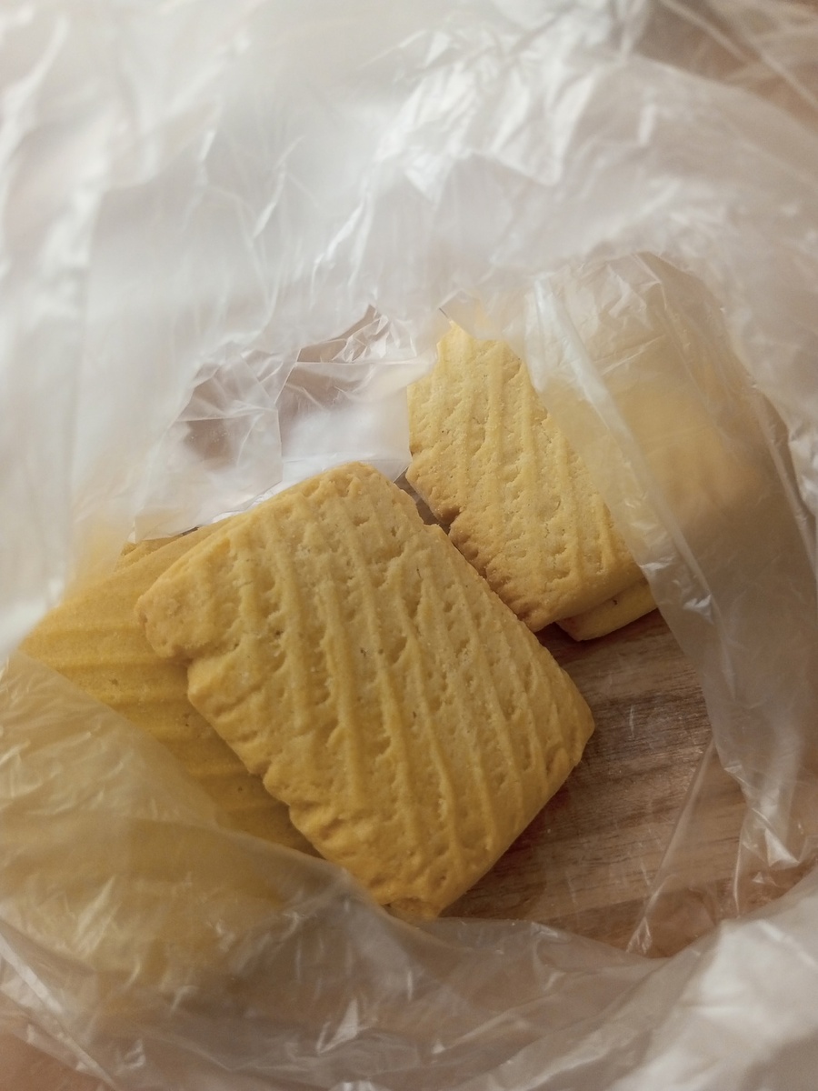 То самое печенье, не помню, чтобы видела или покупала его раньше, но допускаю, что просто забыла. Называется "сливочное", продавец сказала, что очень вкусное, но сильно крошится, поэтому нести домой его аккуратно. Тут действительно правда, потому как положили мне все печенье целое, но уже на кассе оно сломалось от того, что его положили на деревянный шкафчик около кассы. Стоит недорого, не помню точную цифру, я на него засмотрелась лишь потому, что была ассоциация со сливочным маслом.