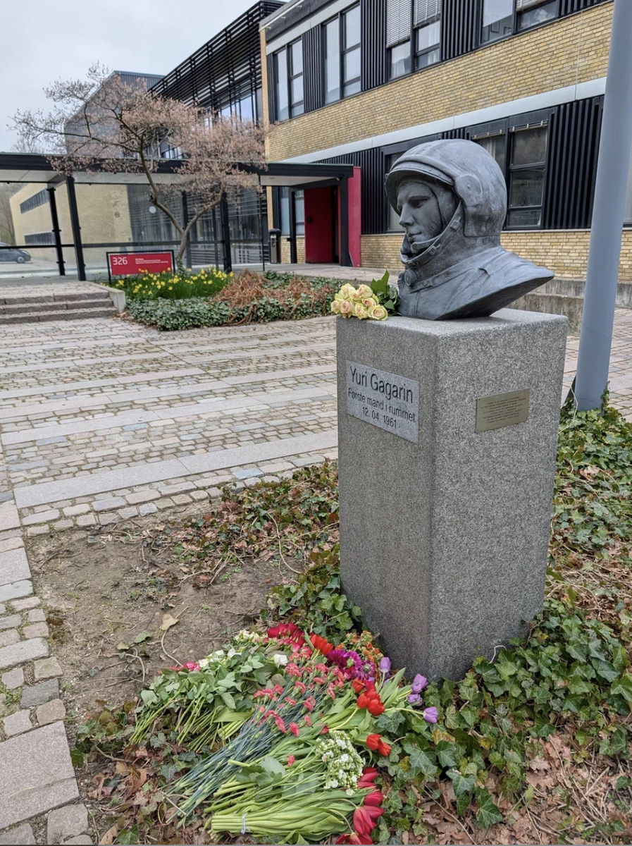 День Космонавтики в этом году пришелся на субботу, а значит, можно было отпраздновать его по-настоящему! Для меня этот праздник имеет особое значение после того, как я побывала на Байконуре и посмотрела на запуск ракеты. Когда в одной социальной сети я увидела объявление про возложение цветов к памятнику Юрию Гагарину, который есть у нас в Дании на территории Датского технического университета - очень подходящее место. От меня этот университет недалеко, так что я решила принять участие в этом замечательном празднике. Если бы я знала, чем это закончится! Одевшись потеплее, я прибыла на место торжества. Там уже были 7 русских девочек самого активного возраста, которых я не знала. Но мы же русские, поэтому быстро перезнакомились! Не смотря на холод и резкий ветер, мы старательно отрепетировали возложение цветов для российского телевидения: Затем полюбовались свим творением и пошли на ближайшую лавочку - отмечать, так как предусмотрительные девочки взяли с собой и красное вино, и