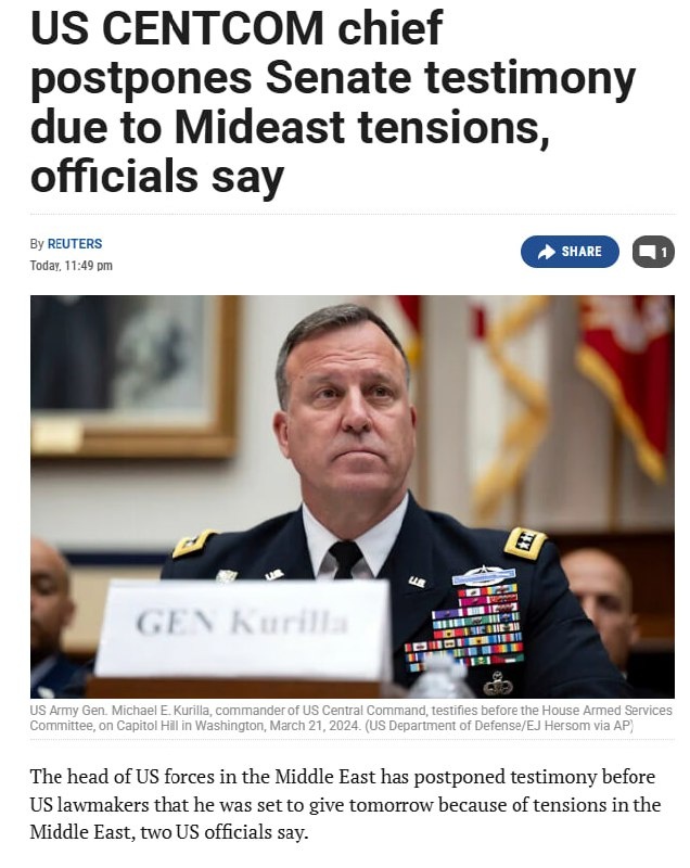 The US’ Middle East commander has canceled testimony in Washington tomorrow Reuters says it’s due to ‘tensions’ in the region Another ominous sign