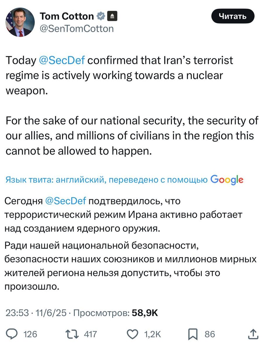 В ответ на пост 🇺🇸🇮🇷 Тем временем, сенатор Том Коттон заявил, что министр обороны США Пит Хегсет подтвердил, что Иран активно работает над созданием ядерного оружия.