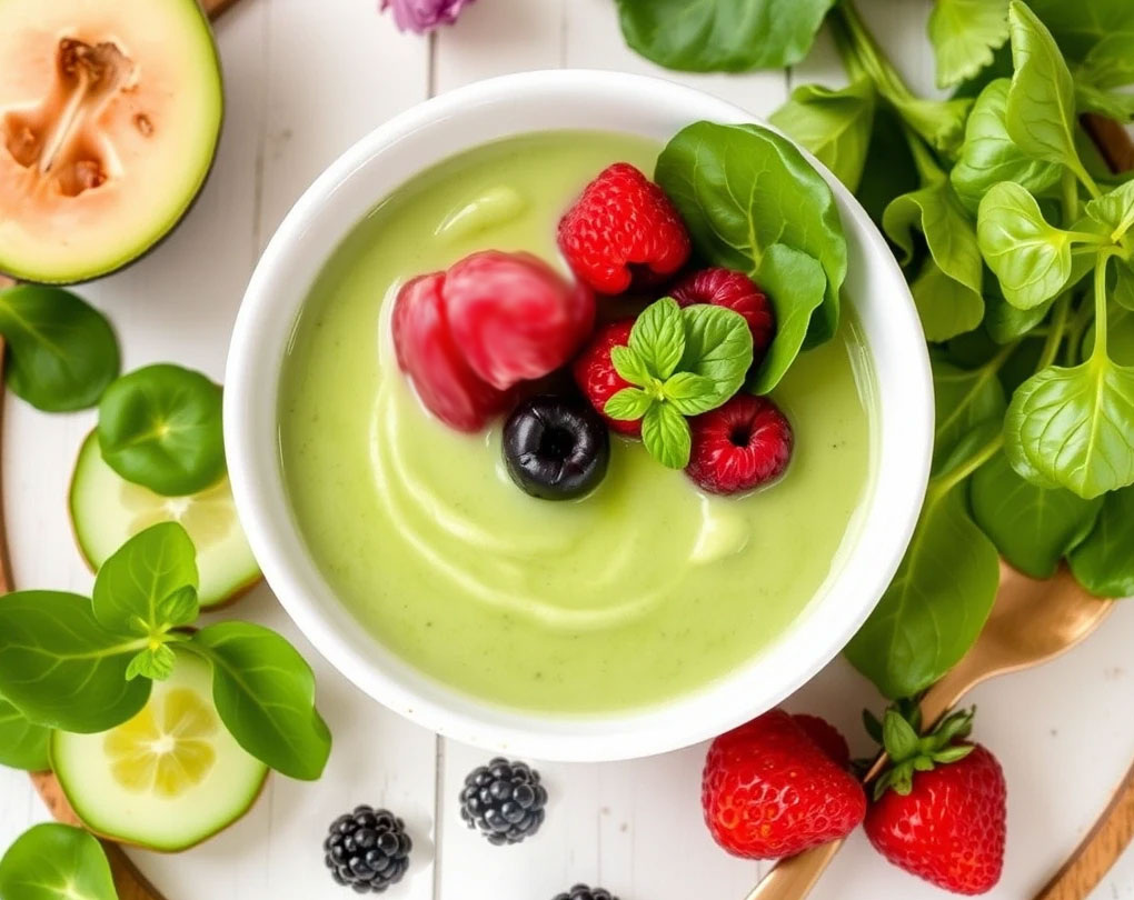 Рецепт Летнего крем-супа из огурцов и шпината с ягодным сорбе