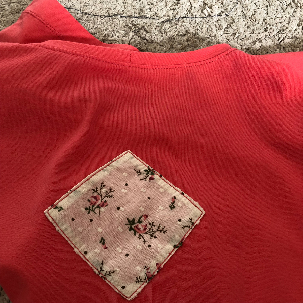 Футболок много не бывает! сшила еще одну. На этой декор расположила на спинке , нашила небольшой квадрат из лоскутка батиста в цветочек. Подгибку выполнила двойной иглой. результатом довольна.