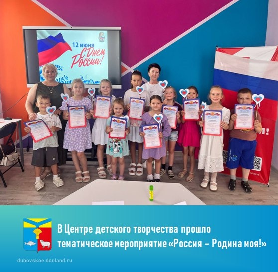 🇷🇺12 июня наша страна отмечает важный государственный праздник – День России. Этот день является символом национального единения, свободы, мира и доброго согласия, общей ответственности за настоящее и будущее нашей Родины. В преддверии Дня России в Центре детского творчества прошло тематическое мероприятие 🇷🇺«Россия – Родина моя!»🇷🇺 В ходе мероприятия ребята посмотрели фильм о России, ответили на вопросы викторины и на мастер-классе «С любовью к России» изготовили поделку. 🎉👏Мероприятие завершилось награждением ребят Грамотой МБУ ДО «ЦДТ» за активное участие. #ДеньРоссии #Центрдетскоготворчества #ДубовскийрайонРостовскаяобласть
