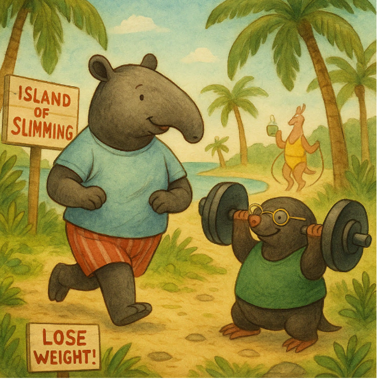 Жил-был Тапир. Не просто тапир, а очень умный, вежливый, слегка эксцентричный и невероятно любознательный зверь. Он читал книги по философии, устраивал чаепития на крыше и даже один раз сочинил хокку о булке с корицей. Но у Тапира была одна маленькая беда — бочки. Милые, мягкие, уютные бочечки, которых он стеснялся и которые так обожал гладить крот Кротон, его лучший друг и единственный постоянный критик. Однажды Тапир наткнулся в лесной газете на статью: «Остров Похудения — революция в теле и разуме! Похудей, стань счастливым, стань настоящим собой!» Тапир задумался. Настоящим собой? А что, если его настоящий "я" — стройный, подтянутый, с кубиками пресса и без этих… проклятых бочков? — Кротон, мы отправляемся, — сказал он, складывая в рюкзак платочек, дневник и запас ройбуша. — Тапир, ты серьёзно?.. — устало вздохнул Кротон, но поехал за компанию. Как и всегда. Остров встретил их странной смесью сочной природы и навязчивых лозунгов. По аллеям ходили ярко одетые существа с круглыми гл