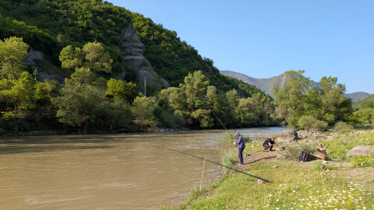Рано утром я проснулся от грузинской речи. Наверное, я занял их место, подумал я, иначе как объяснить, что из всего берега они решили рыбачить именно рядом со мной? Тут как тут и местная собачка, которой вчера вечером перепало немного корма. Ёсик, по обыкновению, прогоняет всех от лагеря, но к ней почему-то снисходителен. Спустя какое-то время другая собака привела на этот живописный берег небольшое стадо. По его взгляду я понял, что явно задержался здесь и мне пора ехать дальше. Проехав совсем немного, я замечаю впереди крепость Слеса, которая расположилась на двух холмах на берегу реки Кура. Крепость построена в 10-11 веках. В 16 веке она защищала территории от Османского вторжения в Грузию. Совсем рядом расположены несколько полей с красными маками. Тропинки, ведущей на вершину, не видно, поэтому штурмую крепость в лоб. И вот я уже внутри цитадели. Открывается хороший вид на маковые поля. Осмотрев окрестности с высоты, я поднимаюсь в главную башню, которая сохранилась