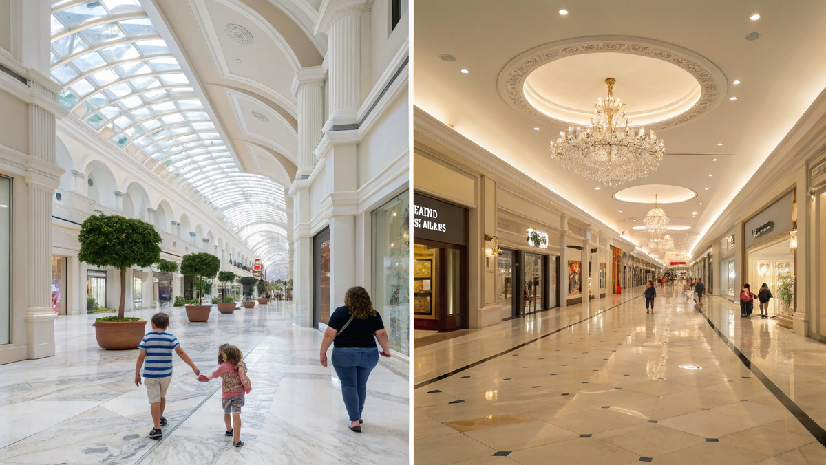 Американские моллы попроще. Стандартная плитка, обычное освещение, минимум декора. Функционально, но без изысков.