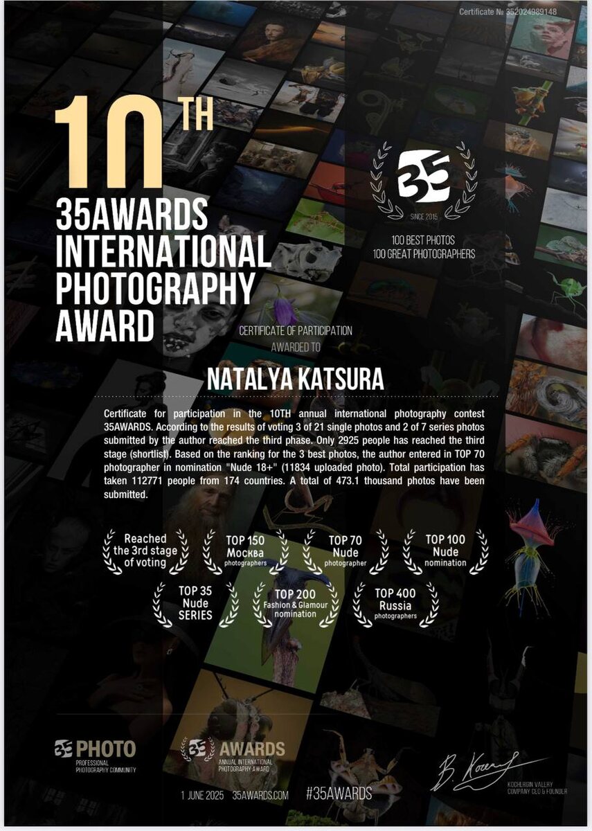 Я пищу от счастья! Я прошла в топ-35! В престижном международном фотоконкурсе 35 PHOTO AWARDS Раньше ни разу не участвовала, но все годы смотрела на них, других победителей и думала… такое не для меня… ну куда мне… ну где я и где они… Но в этом году решила «дать задание помощнице подать на конкурс мои работы и выиграть» Такой типа самообман, скинула с себя ответственность ) если не выиграю, то это не я😅 Она следила за сроками, пинала меня добавлять больше фото на каждом этапе, напоминала о тех.требованиях к фото, и в ночи заливала их на сайт конкурса, чтобы успеть… И вот мы выиграли !!! Боже 🥳 Из 174 стран мира! Фотографы прислали 470 000 фотографий! И мои фото вошли в ТОП! Топ 35 в категории «серия фотографий» Топ 70 в категории Nude Топ 150 фотографов по Москве. Топ 400 по России. И как то случайно залетела в категорию Fashion & Glamour в топ 200) Я даже не могу себе представить математическую вероятность происшедшего. Но это случилось. Голосованием фотографов/зрителей и професси