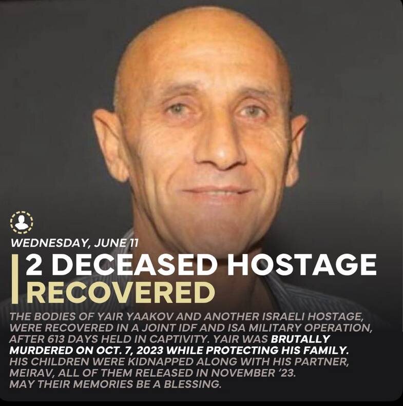 Bodies of 2 DECEASED HOSTAGES recovered — IDF Yair Yaakov, ‘as well as body of another’, recovered in joint IDF and ISA military operation Their bodies were held for 613 days in Gaza