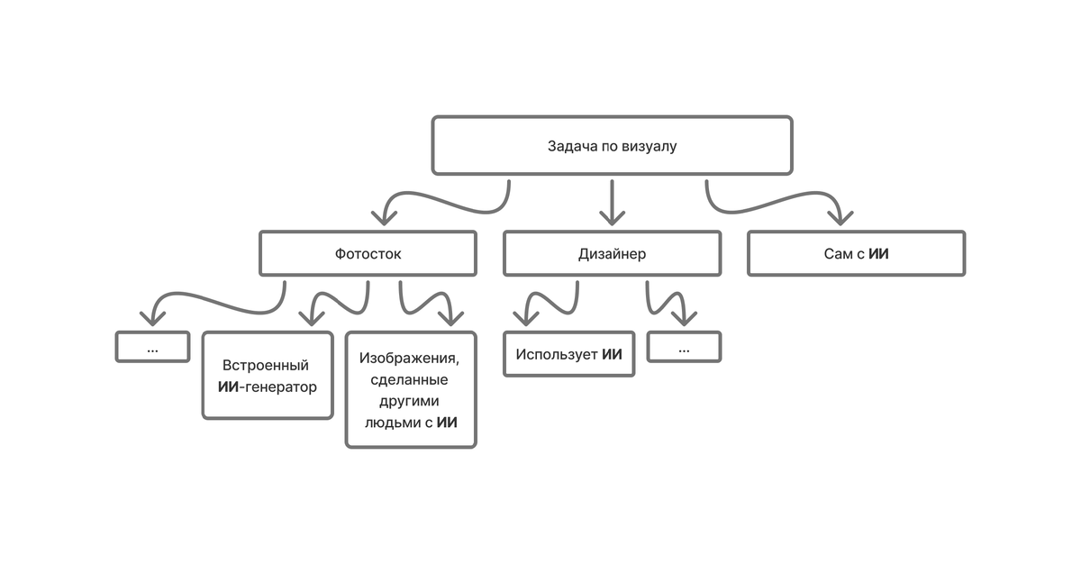 А нужны ли везде нейросети? Обсуждали с коллегой популярность и повсеместное использование нейросетей, в частности для задач по визуалу. Когда уже есть некоторый опыт работы с профессиональными инструментами (Adobe и др.) и нейросетями для достижения аналогичного результата, можешь интуитивно подбирать, какой инструмент будет более подходящим в конкретной ситуации: сделать самому в программах для дизайнера или с использованием нейросетей. Если года 3 назад заказчик мог выбирать между стоковыми изображениями и работой дизайнера (или сделать самому "на коленке"), то сейчас альтернативой является ИИ. Причем инструменты ИИ можно встретить во всех вариантах: дизайнер может использовать в своей работе нейросети, а фотостоки позиционируют себя как ИИ-платформы, где помимо привычных изображений есть ИИ-сгенерированные, а также встроены нейросети для генерации. Делаешь сам с ИИ / покупаешь, то что сделали другие с ИИ / покупаешь то, что сделано вручную другими.