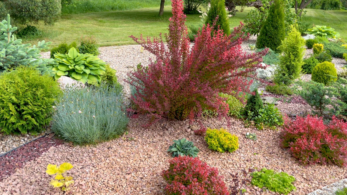 С другой стороны от барбариса посажен очиток скальный с светло-зелеными листьями, во время цветения распускаются розовые соцветия на приподнимающихся цветоносах.