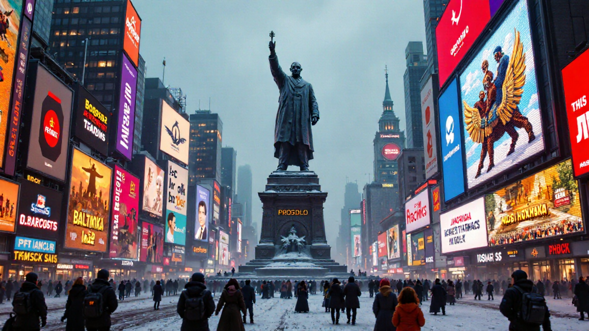 Представьте Нью-Йорк, но не тот, что знаем мы – с небоскребами из стекла и стали, желтыми такси и Статуей Свободы. А Нью-Йорк альтернативный, где история свернула иначе, и Большое Яблоко стало частью бескрайних российских просторов. Каким бы он был? Вместо Эмпайр-стейт – "Сталинский Эмпайр", вместо Центрального парка – "Центральный сквер имени Горького", а по Бродвею шествуют не герои мюзиклов, а участники первомайской демонстрации. Давайте отправимся в это гипотетическое путешествие и с помощью нейросети увидим знакомые локации, преображенные русским духом, архитектурой и бытом. Готовы? Поехали! Таймс-сквер по-советски. Знаменитый перекресток миров утопает в неоновых вывесках кириллицей: "Аэрофлот", "Балтика", "Мосфильм". Вместо рекламных щитов – портреты вождей, а в центре площади гордо возвышается монументальный Ленин. Люди в валенках и ушанках спешат по заснеженной брусчатке. Драматичное освещение подчеркивает масштаб и идеологию. Центральный сквер имени Пушкина. Зеленые легкие Нью