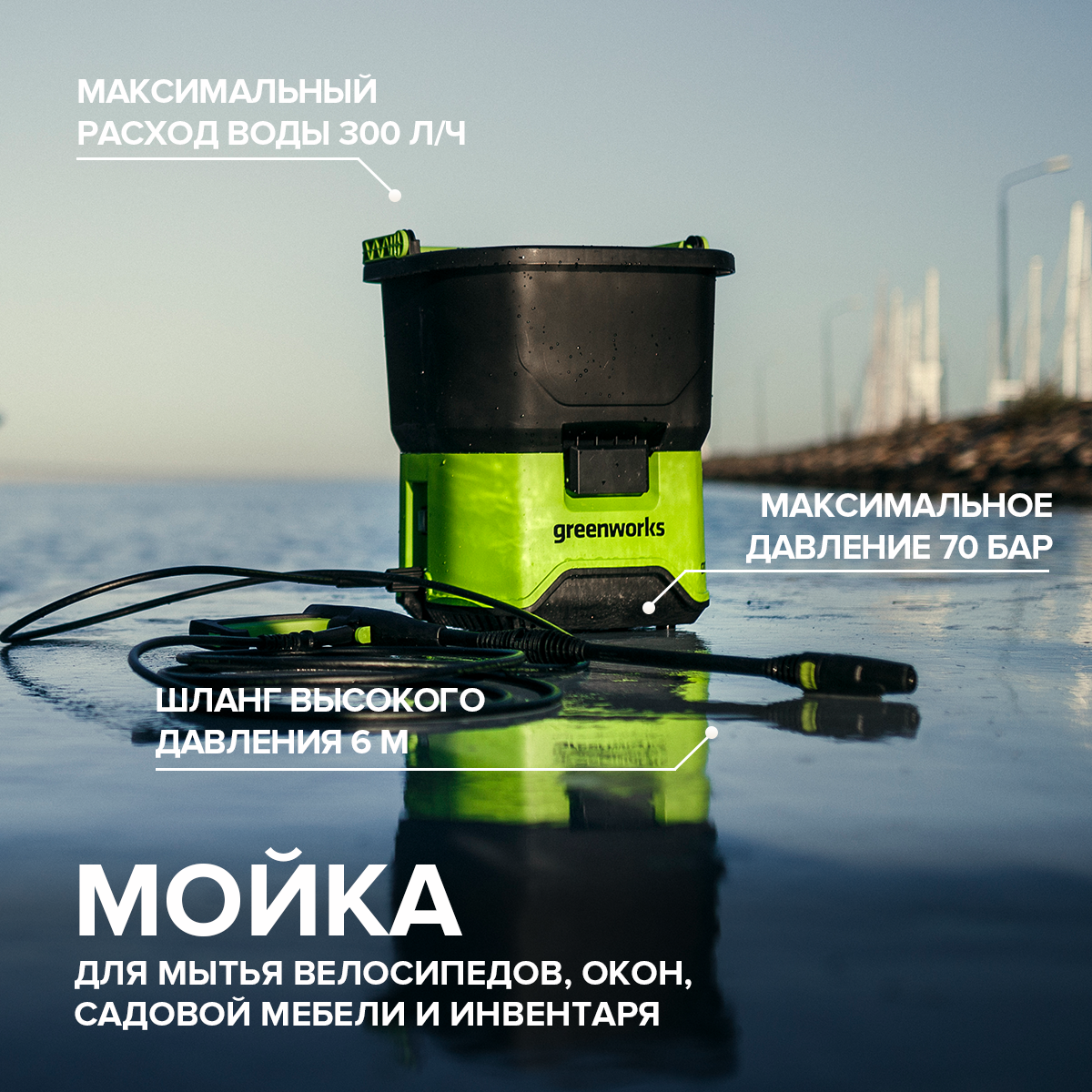 Аккумуляторная мойка высокого давления Greenworks GDC40 (5104507) 40V – ваш главный и незаменимый помощник в мытье машин, велосипедов, садовой мебели, окон и садового инвентаря.