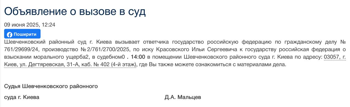 Кто такой Красовский Илья Сергеевич, скажите мне скорее, и что конкретно сделала ему Российская Федерация, что ее пытается щемить Шевченковский районный суд? Чем обидела, каким местом наступила ему на крайнюю плоть? Какие моральные и физические страдания причинила, что он теперь требует моральный вред?