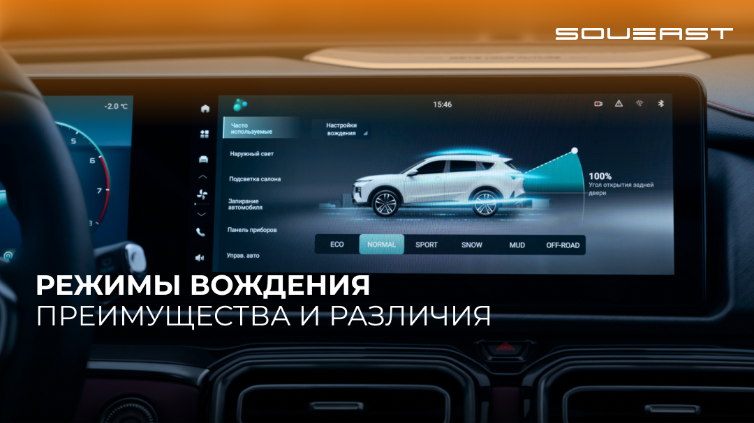 Выбирая автомобиль, вы выбираете свободу передвижения: от городских пробок до заснеженных просёлочных дорог. SOUEAST S07 и S09 с системой выбора режимов вождения делают эту свободу абсолютной. Интеллектуальные алгоритмы адаптируют автомобиль под любые условия — рассказываем, как это работает и почему изменит ваш опыт вождения. Три или шесть — зависит от комплектации В моноприводных версиях младшей модели доступно на выбор три режима: Normal («Нормальный»), Sport («Спортивный») и Eco («Экономичный»). В топовой комплектации SOUEAST S07 и флагманском кроссовере S09 их в два раза больше — к стандартному списку добавляются опции Snow («Снег»), Mud («Грязь») и Off-road («Бездорожье»). Как работают разные режимы и в каких условиях они особенно хороши — Eco: экономия без компромиссов