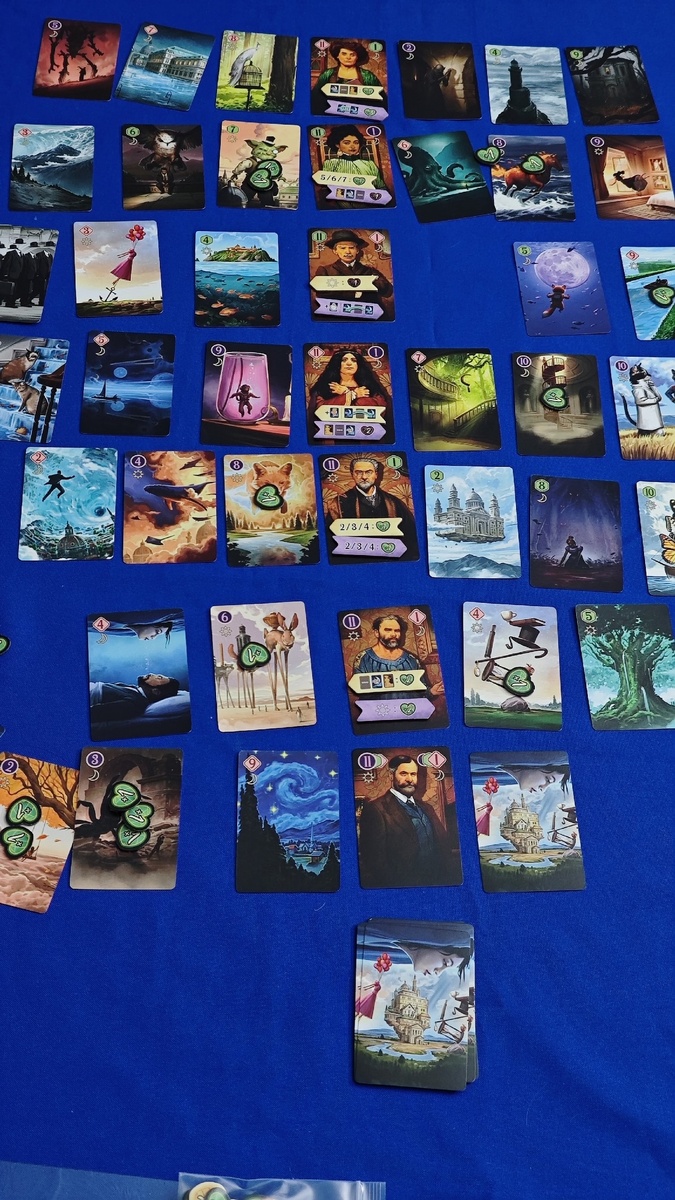 Вчера под вечер разложили с Олей настольную игру Страна снов. Про Страну снов слышали немногие, но сеттинг игры разворачивается в мире игры Бессознательное, про которую не слышал, пожалуй, только ленивый. Так вот, упомянув Бессознательное, хочу сказать, что у этих двух игр нет ничего общего, кроме сеттинга и, пожалуй, арта :) Страна снов - это карточная игра,, где вы одновременно выкладываете карты и стараетесь просчитать и перехитрить соперников и выложить карты, которые принесут вам очки. А полученные очки - это разница между значением вашей карты и следующей (они вскрываются одновременно и выкладываются по порядку). Перед игроками лежат жетоны со значениями от 2 до 6. На полученные очки вы как раз переворачиваете эти жетоны. Задача - перевернуть все жетоны быстрее оппонентов (или к концу 14 раунда перевернуть как можно больше). Нюансов там больше, но по сути игра несложная и быстрая. Первые два раунда я умудрялся выкладывать карты так, что Оля получала по 1 ПО (она не могла ничего