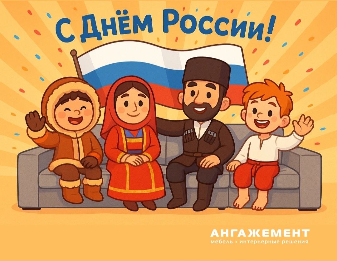 С Днём России! Каждый раз, когда мы создаём новый диван, мы не знаем, куда он отправится. Возможно, он окажется на ближайшей улице Краснодара, и покупатель, проходя мимо фабрики, будет вспоминать, как выбирал ткань под свой интерьер. А может, диван отправится в столицу Северной Осетии — Владикавказ, и из окна гостиной будет любоваться горами Северного Кавказа. Или же он проделает долгий путь и окажется во Владивостоке, где вид на остров Русский будет радовать новых хозяев своим комфортом и красотой. От лица мебельной фабрики «Ангажемент» поздравляем всех наших подписчиков с Днём России! Надеемся, что наш труд помогает жителям всей страны лучше отдыхать, а значит — работать продуктивнее и делать жизнь в России лучше с каждым днём! С Днём России! Команда мебельной фабрики "Ангажемент" Изображение сгенерировано нейросетью по запросу "Нарисуй открытку на День России, с жителями России на диване в национальных костюмах"