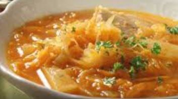 Ингредиенты: - 300 г квашеной капусты - 60 г кореньев - 1 головка репчатого лука - 1 ст. л. жира - 4 ч. л. сметаны - 1 ч. л. муки - перец - лавровый лист - зелень - 1 л бульона - 1 ст. л. томатной пасты Приготовление: Тушите квашеную капусту примерно час, добавив немного воды. Коренья и лук порежьте мелкими кусочками, обжарьте вместе с томатной пастой и соедините с капустой. Переложите всё в горячий бульон и поварите ещё 15–20 минут. По желанию заправьте суп обжаренной мукой и добавьте предварительно отваренный до полуготовности картофель. Перед подачей положите куски мяса, посыпьте свежей зеленью и подавайте со сметаной.