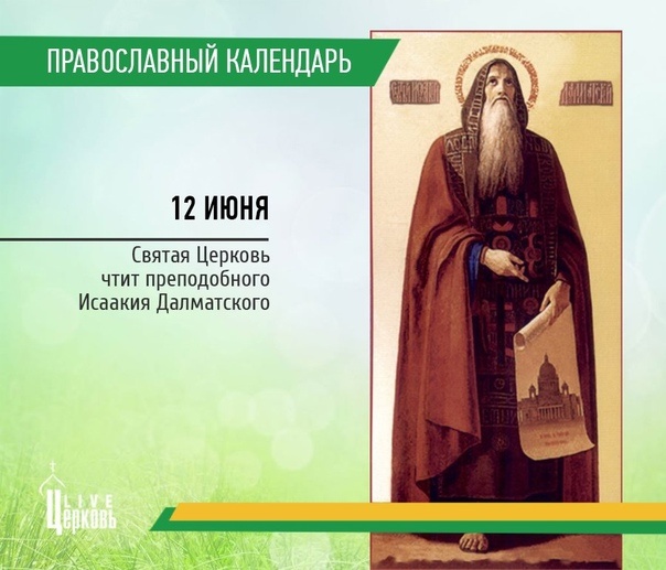12 июня 2025 года - четверг, седмица 1-я по Пятидесятнице. Троицкая седмица В этот день Русская Православная Церковь чтит память: — Преподобного Исаакия исповедника, игумена обители Далматской (383) — Собор святых Пензенской митрополии — Священномученика Василия Смоленского, пресвитера (1942) ------------------------------------------- 💞 Сегодня именины празднуют: Исаакий, Василий Поздравляем всех именинников с днем Ангела! Желаем им крепкого здоровья, духовной радости и Божьего благословения. ------------------------------------------- 🍵 ПОСТ И ТРАПЕЗА 12 июня 2025 г., четверг, поста нет ------------------------------------------- 💠ИСТОРИЧЕСКИЕ СОБЫТИЯ — 12 июня 1798 г. в Санкт-Петербурге учрежден институт Святой Екатерины для Благородных девиц — 12 июня 1973 г. родился епископ Кинельский и Безенчукский Софроний (Баландин) ------------------------------------------- 👀 ИНТЕРЕСНЫЕ ФАКТЫ ИЗ ЖИТИЯ СВЯТЫХ И ИСТОРИИ ПРАЗДНИКА — Преподобный Исаакий происходил «с востока», по