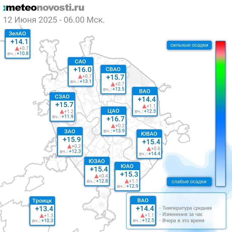 В 6:00 в Москве было от +13°C до +17°C, средняя температура +15.3°C #погода #Москва #лето #температура #12июня #четверг