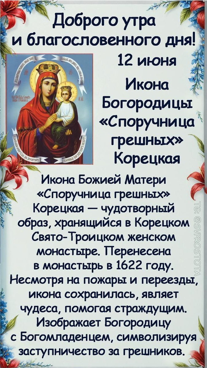 📕 Сегодня 12 июня 2025 года четверг, поста нет Церковь прославляет Пресвятую Богородицау, ради образа Ея "Споручница грешных".