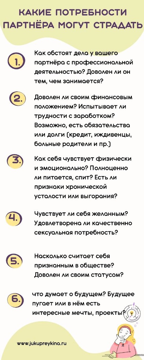 Забавно и одновременно трагично явление тотального человеческого субъективизма. Ни разу в моей практике не было случая, когда клиент пришёл бы с запросом научить его заботиться о потребностях его любимого, близкого человека. Скажу больше: когда спрашиваю о том, в чём нуждается ваш партнёр, слышу: «я не понимаю, что ему/ей нужно». Но знаете — это очень естественно. Наша психика устроена таким образом, что мы считаем: центр Вселенной примерно в той самой точке, где наша душа. Всё вокруг должно вертеться вокруг нас и служить удовлетворению наших потребностей. Учимся навыку с подготовленными мною шпаргалками!💚 Психолог Юлия Купрейкина