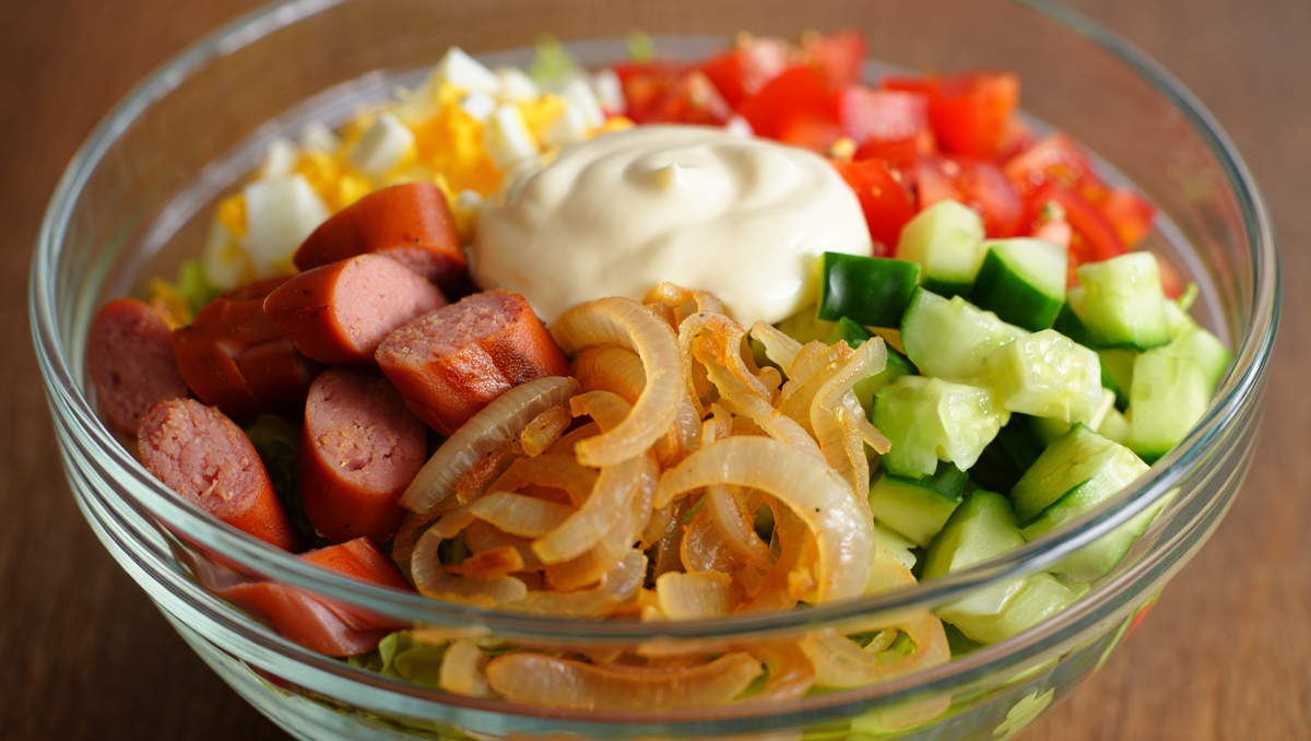 Салат с карамелизированным луком 🥗 — настоящая находка для праздничного стола! Яркий, сочный, с насыщенным вкусом карамелизированного лука и яркими вкусами овощей. Он легко адаптируется под ваши предпочтения и готовится быстро — идеальный вариант для вечернего ужина или когда гости уже на пороге. Быстро и просто: Минимум времени — максимум удовольствия Ингредиенты Куриное филе (или колбаса) — 200 г Яйца — 3 шт. Свежий огурец — 1 шт. Помидор — 1 шт. Лук репчатый — 1 шт. Майонез — по вкусу Соль, перец — по вкусу Масло для жарки Сахар — 1 ч. л. (для лука) 🟩 Нарежьте лук полукольцами, обжарьте на среднем огне с ложкой сахара до золотистого цвета. Лук должен стать мягким и сладковатым — это главный секрет вкуса салата! 🟩 Куриное филе отварите и нарежьте кубиками. Если используете колбасу — просто нарежьте её небольшими кусочками. 🟩 Яйца сварите вкрутую, остудите и нарежьте кубиками. 🟩 Огурец и помидор нарежьте небольшими кубиками. Можно добавить болгарский перец или зелёный лук для ярк
