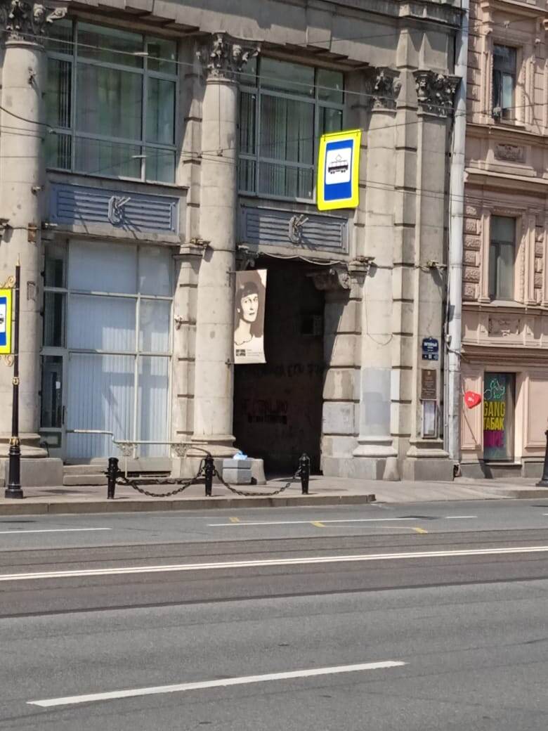 В музей поехала на автобусе. Доехала до Литейного проспекта и по Литейному пошла к дому Некрасова. По другую сторону проспекта прошла мимо музея Анны Ахматовой. Сфотографировала её портрет, который указывает на место входа в музей.