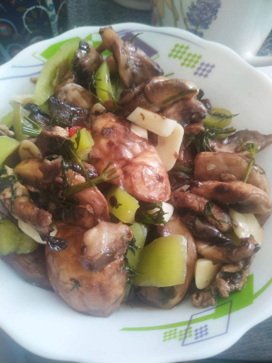 На днях решила сделать грибы по примеру огурцов- в пакете. И, скажу я вам, получилось просто сказочно! Легкий салат, типа корейского, но главное - не перебарщивайте с,солью, как я! 1.Грибы- шампиньоны, как у меня -6-7 шт крупных, но подойдет половина стандартной упаковки из магазина. 2.Чеснок-3-5 зубчиков 3.Укроп-1/2 пучка 4.Сладкий перец -1 шт 5.Перчик чили -1/3 Для заправки: Соль- 2 чайные ложки Уксус яблочный -1 стол/ ложка Соевый соус( опционально)-2 чайные ложки Масло ароматное - 1 стол/ ложка Грибы режем средними ломтиками, ножку тоже берем! Чеснок- режем ломтиками. Укроп-тоже крупно , не мельчим. Перец сладкий - солоской, тут можно помельче. Чили- вот здесь нужно мелко порезать. Все складываем в пакет, хорошенько трясем, чтобы все смешалось. Потом заправляем уксусом, маслом, солью. Еще раз трясем. И убираем в холодильник на 12 часов. Нежнейшие ароматные грибки, которые и на стол не стыдно подать, и самим съесть, и друзей угостить. Грибы получаются слегка в корейском стиле. Ост