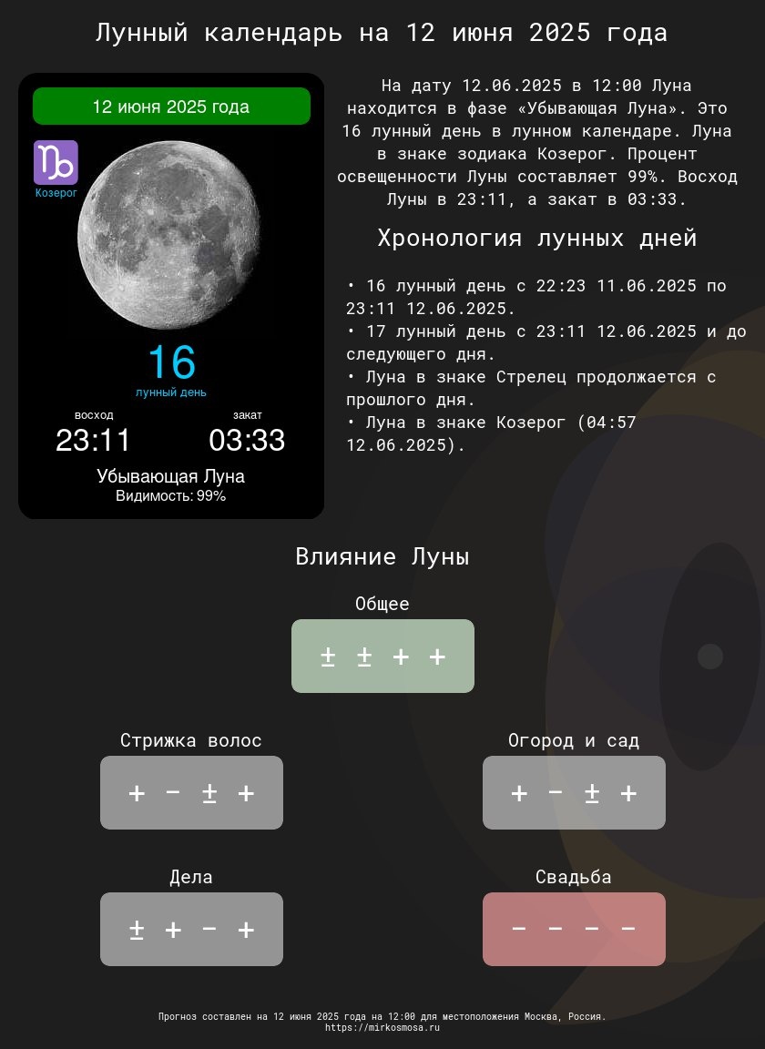 Лунные календари на 12 июня 2025 года: Подготовьтесь к этому дню с учетом влияния Луны! 🔹🌗 Лунный календарь на 12 июня 2025 года — Что приготовила Луна? Подробнее 🔹✂️ Лунный календарь стрижек на 12 июня 2025 года — Подходящий ли день для обновления прически? Подробнее 🔹🌱 Лунный календарь огородника и садовода на 12 июня 2025 года — Лучшее время для ухода за растениями. Подробнее 🔹📅 Лунный календарь дел на 12 июня 2025 года — Удачные моменты для важных задач. Подробнее 🔹💍 Лунный календарь свадеб на 12 июня 2025 года — Подходит ли этот день для вашего торжества? Подробнее