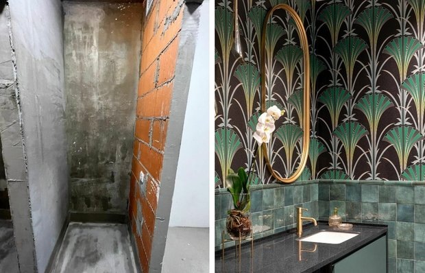 Здесь соединились темная палитра, элегантная отделка и функциональные решения Для проекта квартиры под аренду дизайнер Виктория Шаповалова стремилась создать не просто стильный, но и запоминающийся интерьер. И это особенно заметно в ванной комнате: здесь продумано все — от визуальных акцентов до практичного зонирования. Помещение получилось компактным, но выразительным, с продуманной архитектурной логикой и богатой, но не перегруженной палитрой. Главную роль в оформлении играет сочетание темно-зеленой плитки и черных деталей. Тандем придает интерьеру камерность и глубину, отсылая к эстетике отелей и частных спа. Облицовку стен и ванны выбрали в насыщенном зеленом тоне — он сдержанный, но с богатым подтоном. И хотя яркие обои на стенах ванной комнаты могут казаться не самыми практичными, из-за спецобработки лаком и качественной вентиляции они прослужат не один год. Контрастные акценты внесли за счет латунной фурнитуры: прием оживляет темную гамму, добавляя ощущение тепла и утонченности.