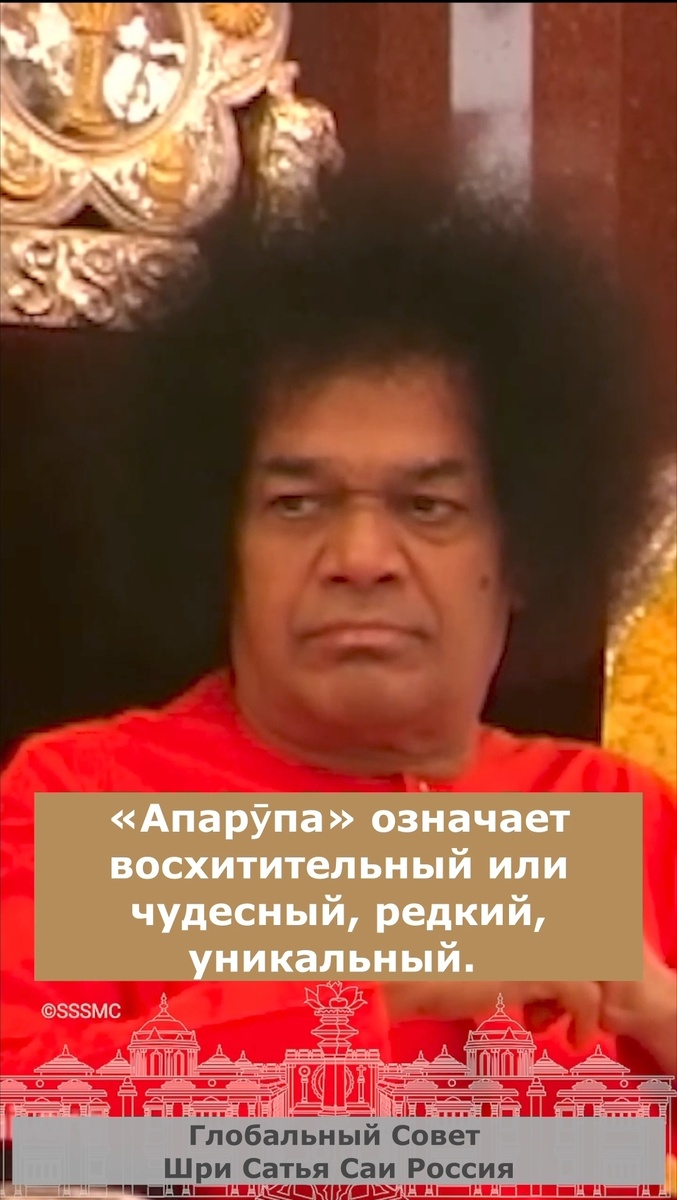 108 имён Шри Сатья Саи Бабы К 100-летию Бхагавана мы продолжаем воспевать 108 имён Шри Сатья Саи Бабы! 58. Ом Шрӣ Сāи Апарӯпа Шактине Намаха «Апарӯпа» означает восхитительный или чудесный, редкий, уникальный. Это имя означает «Тот, кто обладает восхитительными и чудесными силами, вызывающими восторг и удивление у всех». Кто ещё и где ещё мы могли испытать всю славу Божественности, явленную Бабой? Пребывая в каждом сердце, Баба знает все наши поступки, даже когда о них пока мечтают и планируют. Будучи везде и всегда в Пространстве и во Времени, Баба делает видимым Себя, когда пожелает, в любое время и в любом месте, даже в той физической форме, которую Он принял сейчас. Будучи Всемудрым, Баба знает, что лучше для каждого из нас. Начиная с Господа Кришны на земле не являлся никто с равным или большим количеством Шакти, кроме Саи Шакти. Саи Баба в Ширди заявил, что Он Вāсудева. «Я Махалакшмӣ», «Я Витхобā из Пандари», «Я Ганапати», «Я Даттатрейа», «Я Кришна», «Вся эта Все