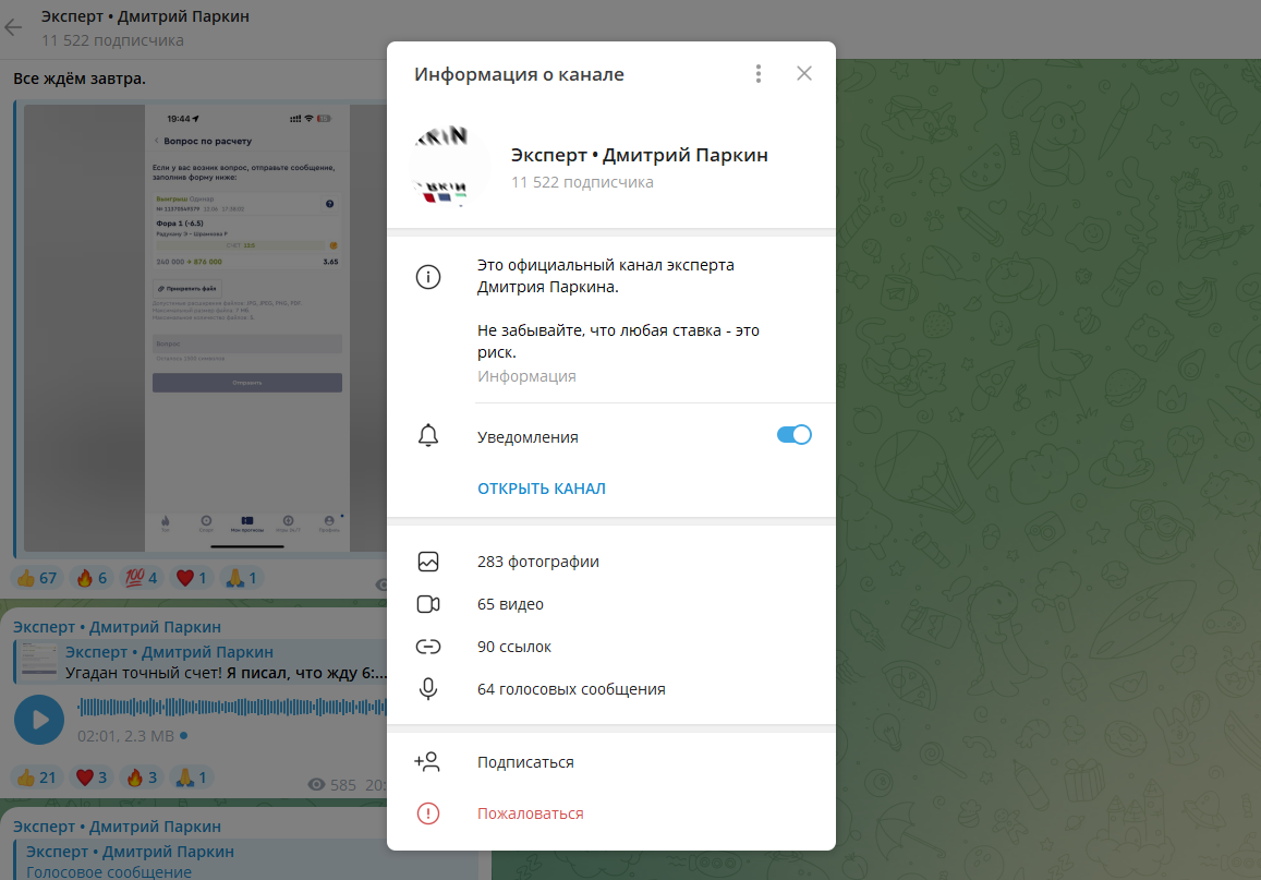 Среди множества телеграм-каналов, которые предлагают ставки на спорт, есть реально толковые сообщества, а есть обычные мошеннические страницы. Сегодня мы хотим проверить один из пабликов под названием Эксперт Дмитрий Паркин. Автор говорит, что он хорошо разбирается в большом теннисе, поэтому и его прогнозы приносят большую прибыль.