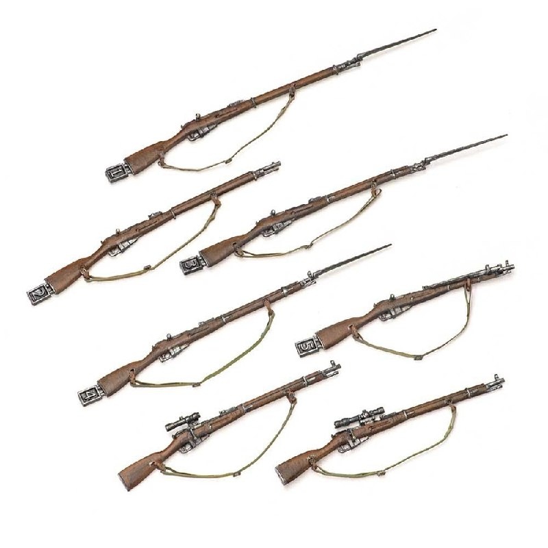 MiniWar Paint из Москвы выпустила набор моделей "Разновидности винтовки Мосина" в масштабе 1/35 из полиуретановой смолы. Набор включает в себя: 01 - пехотная винтовка обр. 1891 02 - пехотная винтовка обр. 1910 03 - драгунская/казачья винтовка обр.1910 04 - винтовка 1891/30 05 - карабин 1891/30 - 1944 винтовка с прицелом ПЕ винтовка с прицелом ПУ В наборе присутствуют детали, позволяющие собрать винтовки как с примкнутым штыком, так и без него.