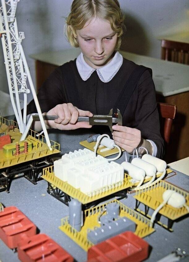 - Обстоятельства: На фото дети разных возрастов, одетые в школьную и повседневную одежду того времени. Видно, что занятия проходят в просторном и хорошо оборудованном помещении. В фоновом плане можно заметить наглядные пособия, инструменты и материалы для творчества.