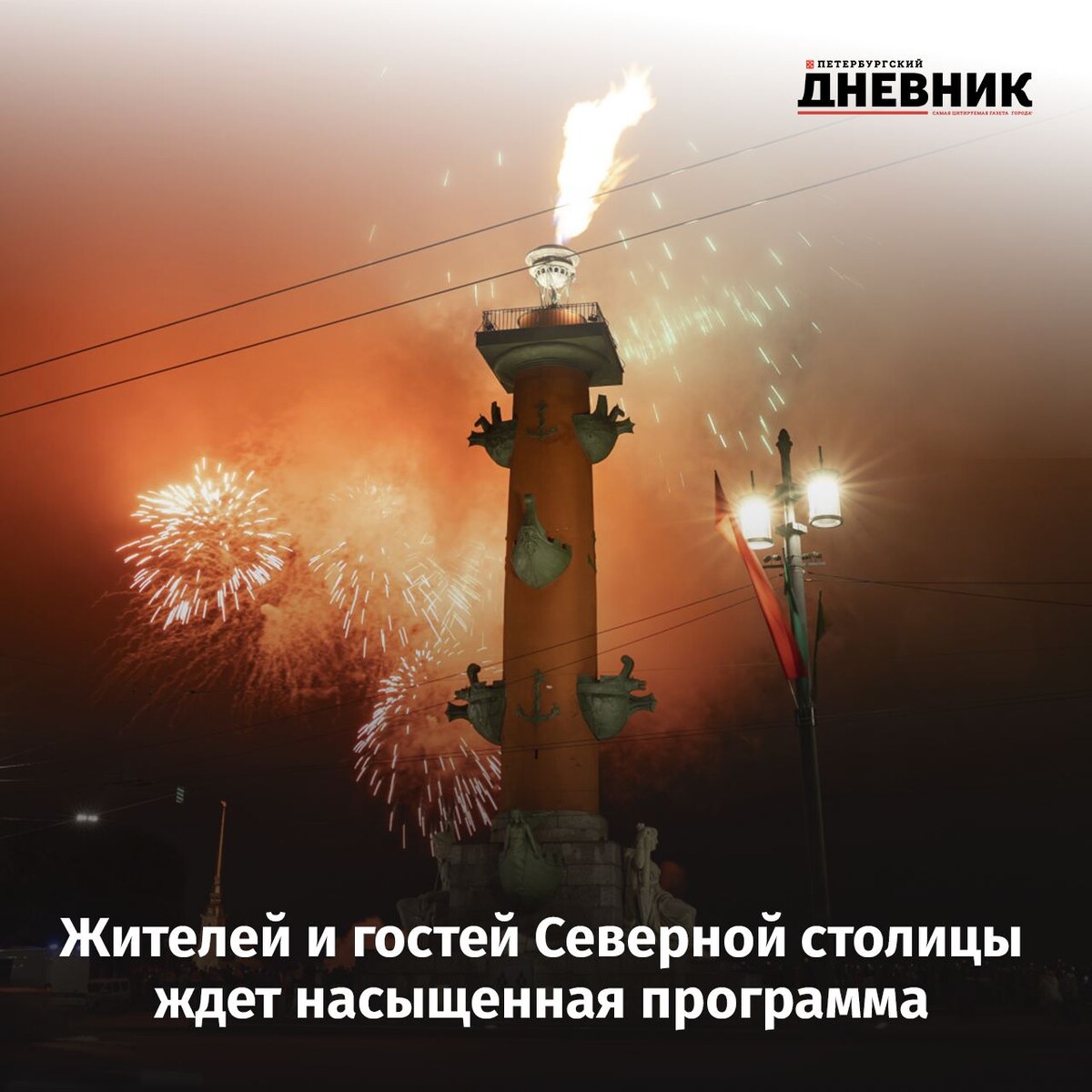 В честь праздника зажгутся факелы на Ростральных колоннах, а Дворцовый, Троицкий мосты и мост Бетанкура получат световое оформление в цветах государственного флага России. Факелы будут гореть с 21:00 до 23:00, а подсветка мостов — с 23:15 до 2:30 ночи 13 июня.