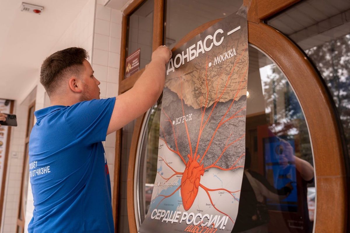 Молодёжь расклеила плакаты «Донбасс – сердце России» в центре Донецка