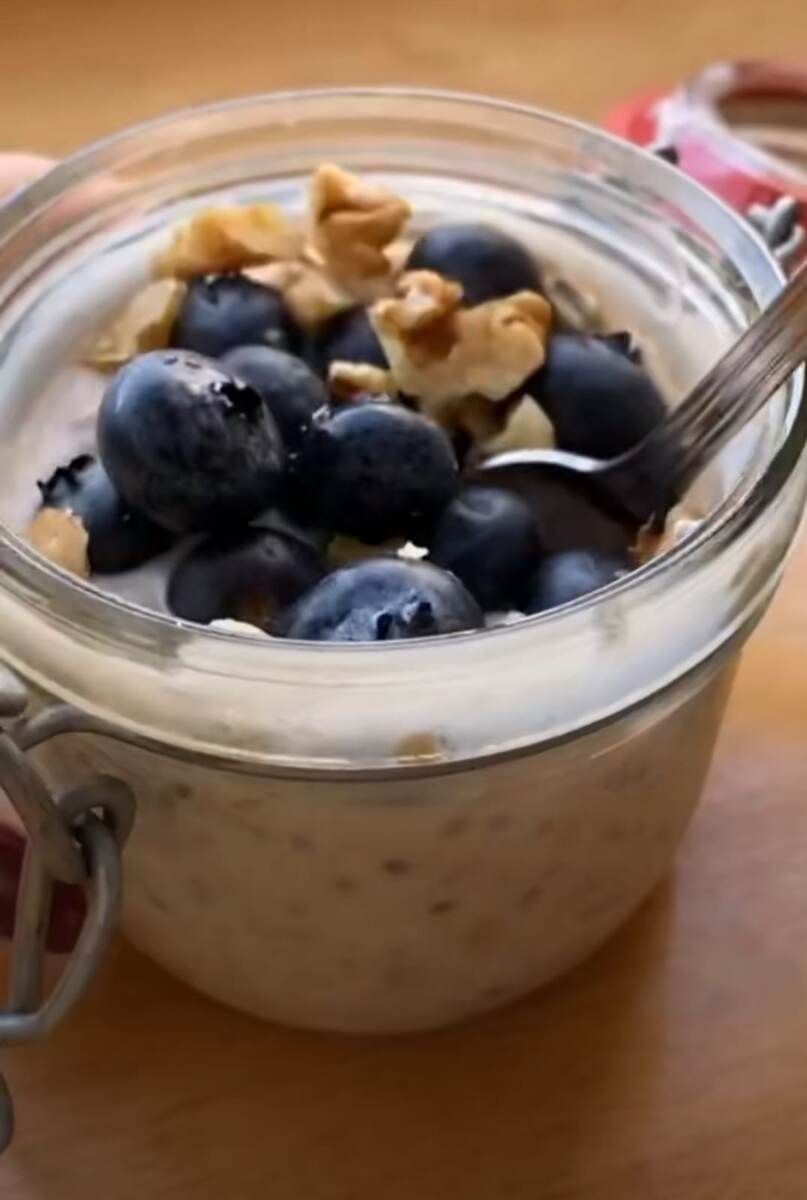 Для начала мы берём кружку и насыпываем туда 2 столовые ложки овсяных хлопьев. Добавляем 2 столовые ложки молока и одну столовую ложку йогурта. Насыпываем 1 чайную ложку и любой подсластитель какой вы хотите, 1 столовую ложку. Потом гладем в холодильник на все ночь. Просыпаемся утром, встаём и вытаскиваем наш шедевр. Добавляем туда любимые ягодки и орешки. И наша вкусняшка готова!!!😋