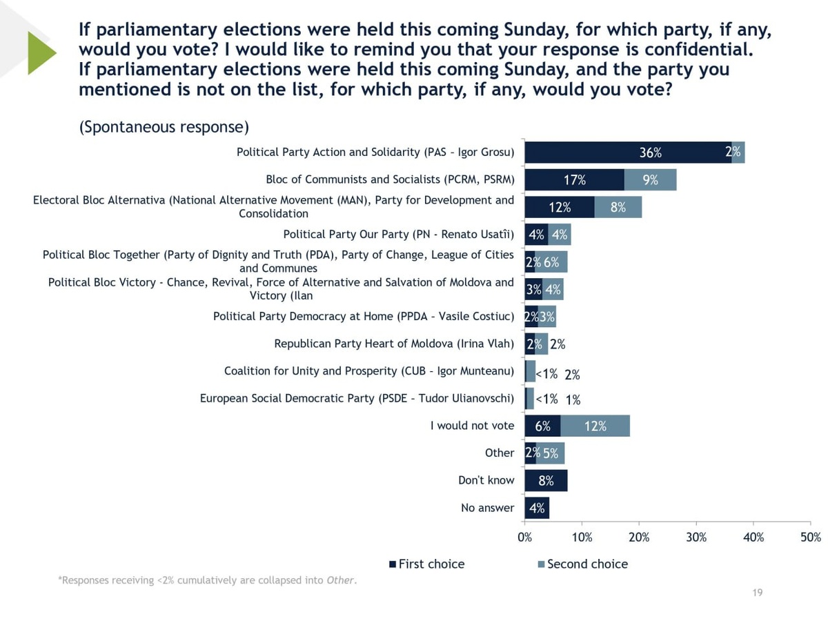 ⚡️🇲🇩Почти без изменений. Каким может быть новый парламент РМ? В случае проведения парламентских выборов в ближайшее воскресенье в законодательный орган страны пройдут три политические силы. Такие данные (почему-то на английском языке) показал опрос, проведенный компанией Magenta Consulting по заказу Международного республиканского института (IRI). Согласно опубликованным результатам, в парламент пройдут партия “Действие и солидарность” (PAS) - 36%, Блок коммунистов и социалистов (БКС) - 17% и блок «Альтернатива» - 12%. ☝️😐Интересный расклад. А вы как думаете? @eNewsmd.online 👈 Подписывайтесь на наш канал