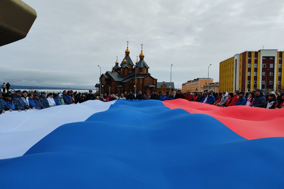 Партийцы Чукотки провели автопробег, вручили ленты триколор прохожим и развернули вместе с горожанами 30-метровый флаг Российской Федерации